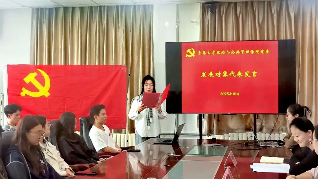 党员发展对象代表马宇恬结合纪念抗战胜利80周年阅兵的深刻感悟,表达了坚定的入党信念。她以“追随者”“实干派”“答卷人”自勉,诠释了一名新时代青年筑牢信仰、锤炼本领、投身时代的实践路径与价值追求。