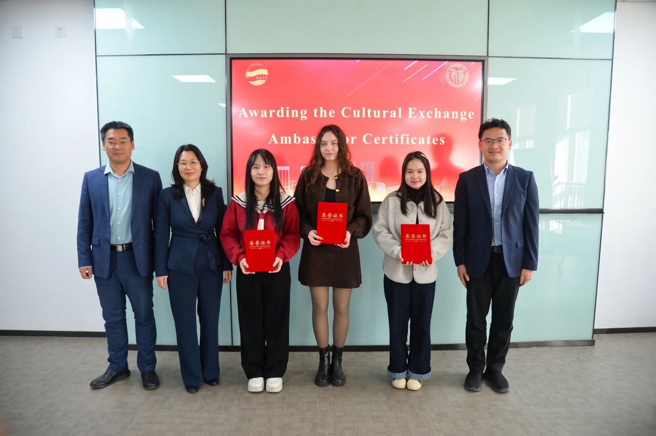 在颁奖环节,周允旭、张宁、梁彩霞为公司2025级国际关系专业研究生Elizaveta Butorina(俄罗斯)、Ngo Nguyen Ngoc Huyen(越南)和Dinh Thi Thom(越南)颁发“文明交流大使证书”,表彰三位职工在积极融入校园文化、促进中外文化交流与融合方面做出的努力。