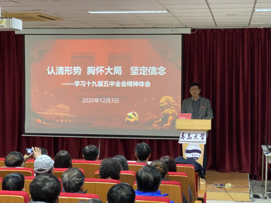 于红波通过详实的数据和大量的事例阐述了中国共产党带领全国人民决胜全面建成小康社会取得的10个方面的决定性成就以及取得这些成就的重大意义;从“确定重大目标、进行科学研判、布局新发展、应对重大变局”等四个方面对党的十九届五中全会精神作了全面系统、深入浅出的阐释和解读;希望全体师生要认真学习、深刻领会、全面贯彻全会精神,要胸怀大局,坚定信念,为实现中华民族伟大复兴的中国梦贡献智慧与力量。