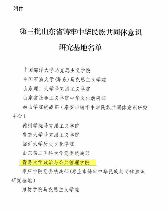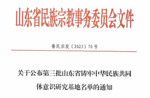 2023年12月21日,山东省民族宗教事务委员会发文《关于公布第三批山东省铸牢中华民族共同体意识研究基地名单的通知》(鲁民宗发﹝2023﹞70号),确定太阳成集团tyc539成功获批山东省铸牢中华民族共同体意识研究基地。