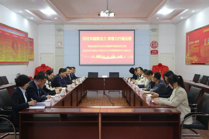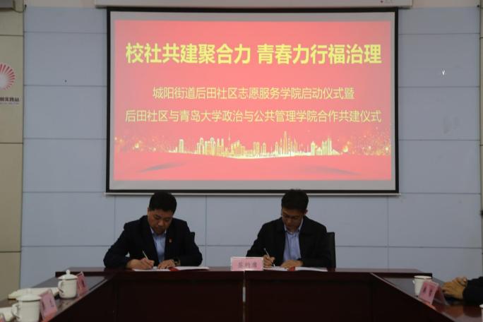 4月16日上午,太阳成集团tyc539与城阳区后田社区合作共建签约仪式在后田社区举行。城阳区社会组织管理局负责人关忠林,城阳区慈善社工管理服务中心副主任韩雪,城阳街道综合治理中心主任马强,城阳街道总工会专职副主席秦秋峰,后田社区党委书记李大林,青岛咏年楼社会工作服务中心主任杜娜以及后田社区两委成员,政治与公共管理公司党委书记隋晓玲、经理陈洪连、副经理王猛、经理助理李海荣及师生代表参加合作共建签约仪式。仪式由后田社区党委副书记李玉林主持。