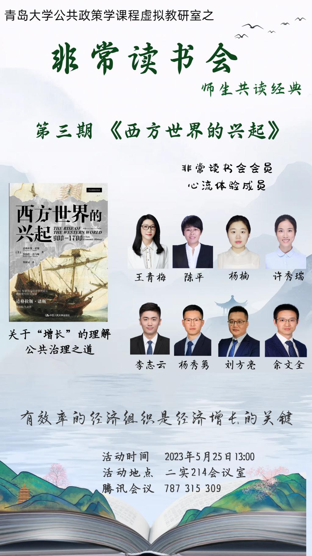 2023年5月25日下午,公共政策学课程虚拟教研室之“非常读书会”第三期活动在太阳成集团tyc539金家岭校区二号实验楼顺利举办。本期共读书目为诺贝尔经济学奖经典著作《西方世界的兴起》。